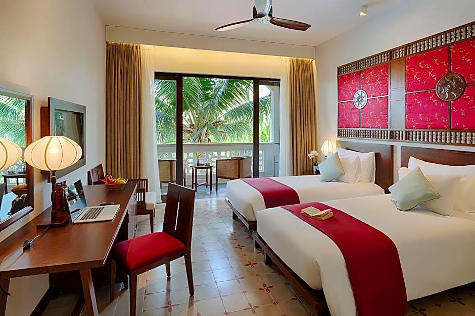 Elegantly furnished in chocolate-hued real dark wood, enriched with a touch of traditional Vietnamese ornaments the Grand Deluxe room combines tradition with all modern amenities. Decorated in warm and light colors, boasting wide and high windows the room feels very spacious, bright and cozy. . High windows offer plenty of natural light and a private balcony opens up to views of the pool, green garden, old town and river. The unit offers 2 bed.