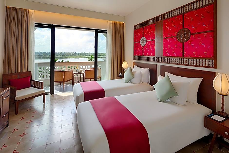 This twin room is equipped with Wi-Fi, cable TV, a fully stocked mini-bar, free tea/coffee making facilities, in-room safe, work desk and 24-hour Room Service. The bathroom has a shower with toiletries, bathrobes and slippers. The highlight is the beautiful view of the river, garden and swimming pool from the spacious balcony. The unit offers 2 beds.